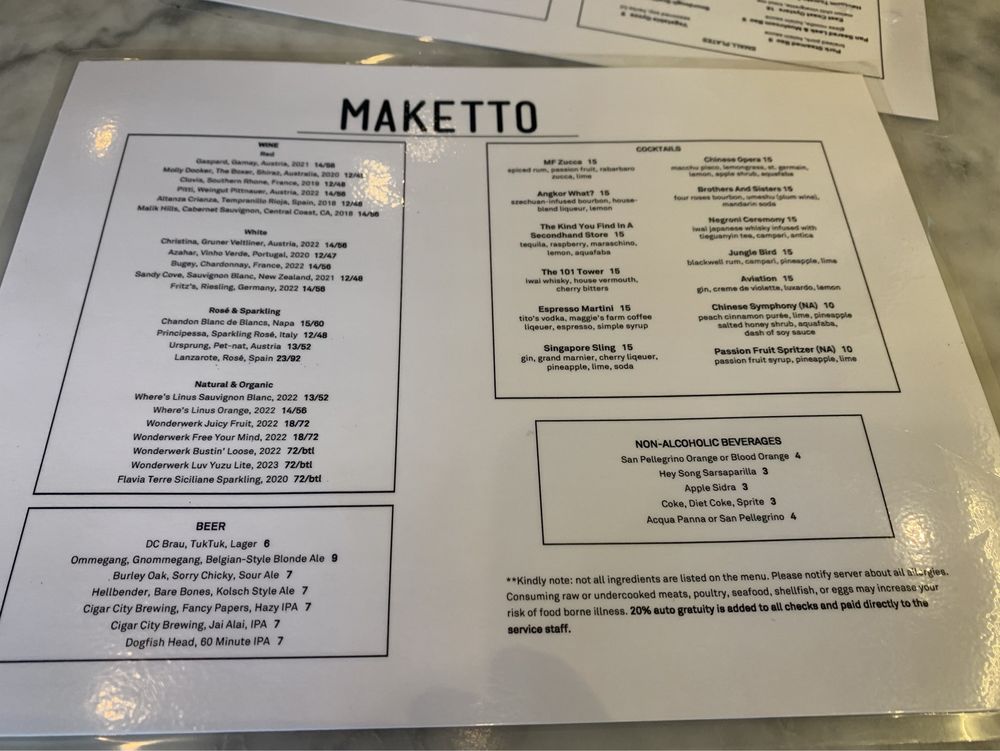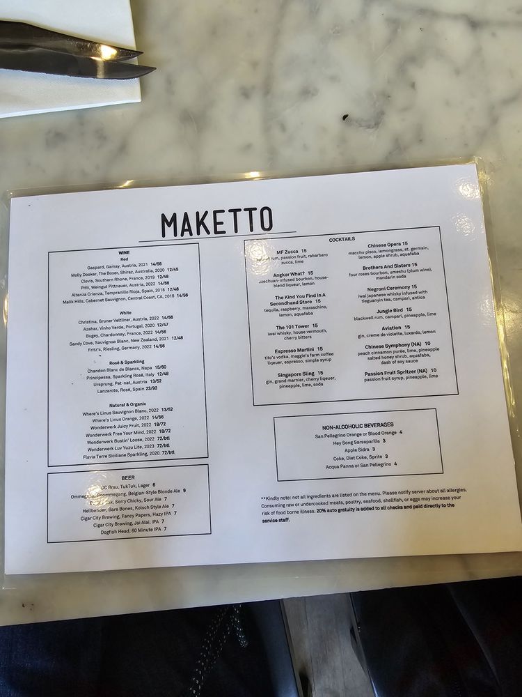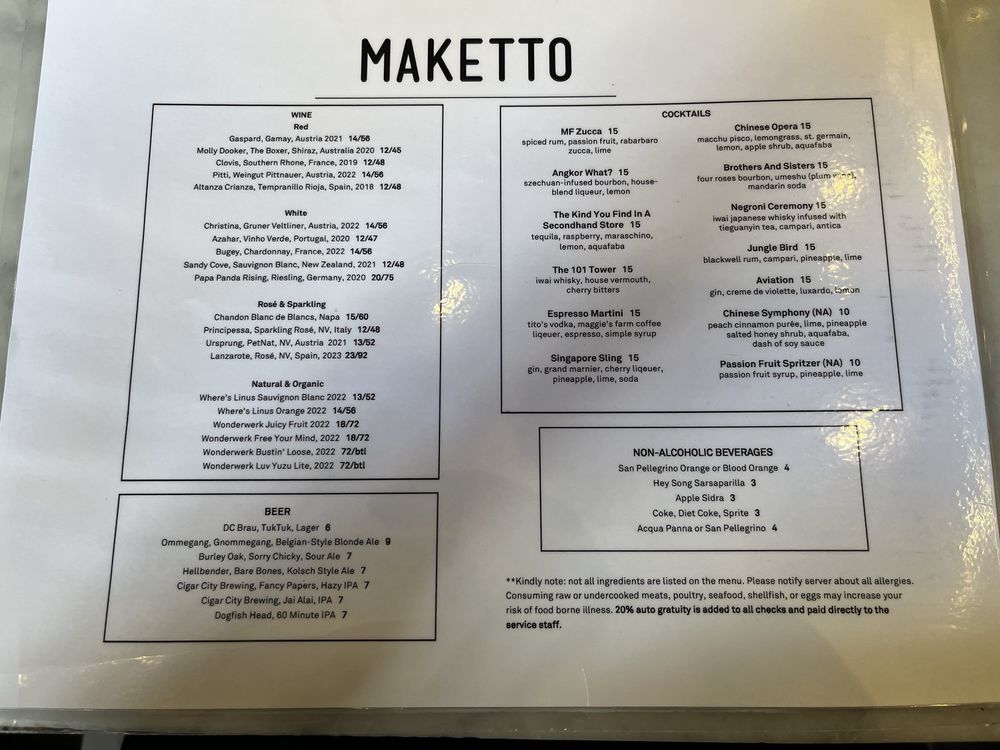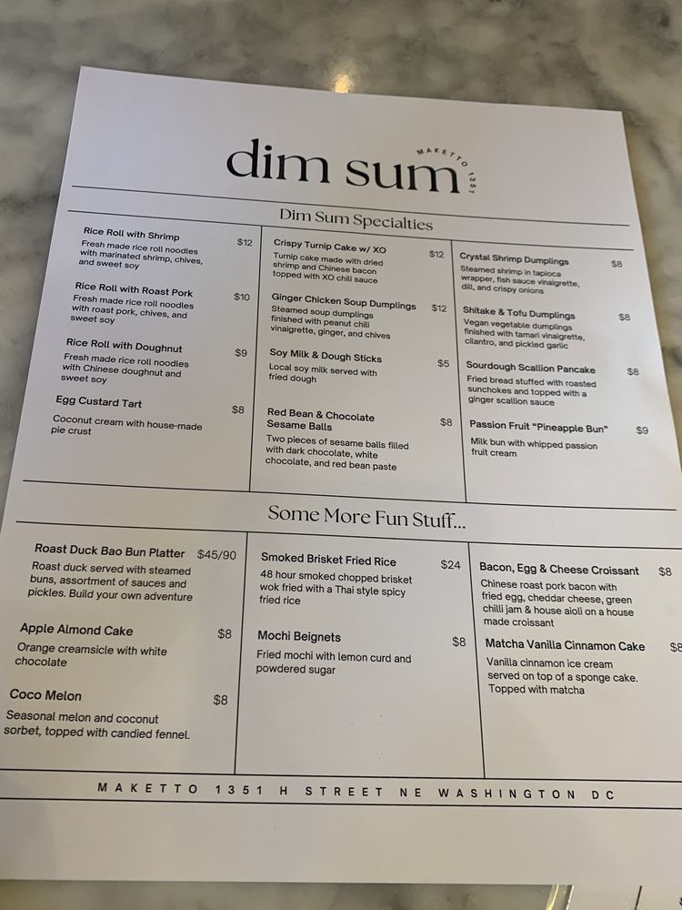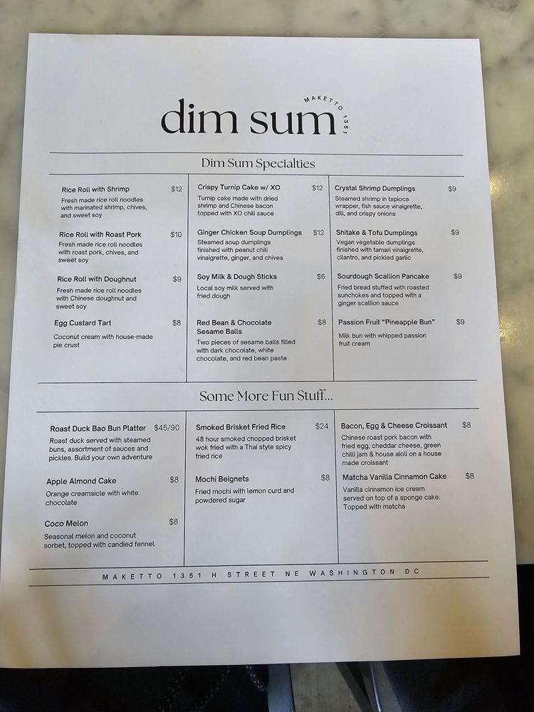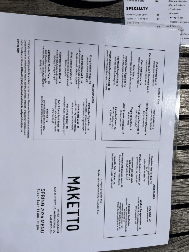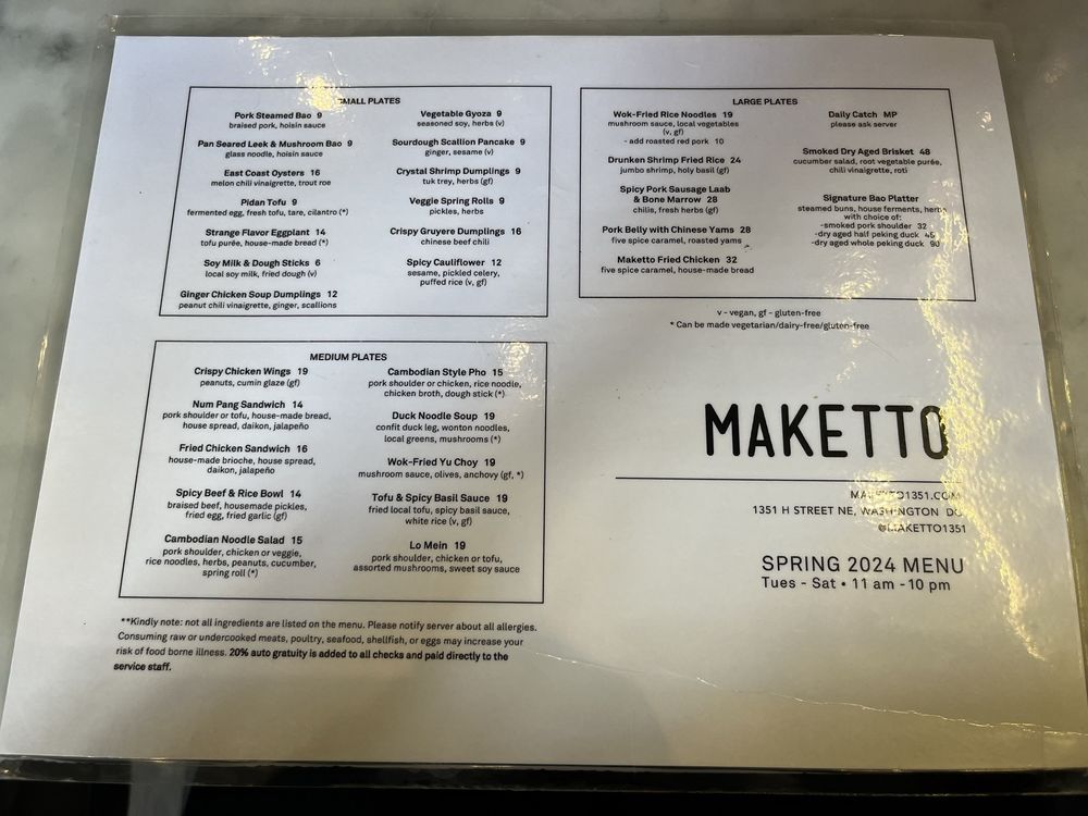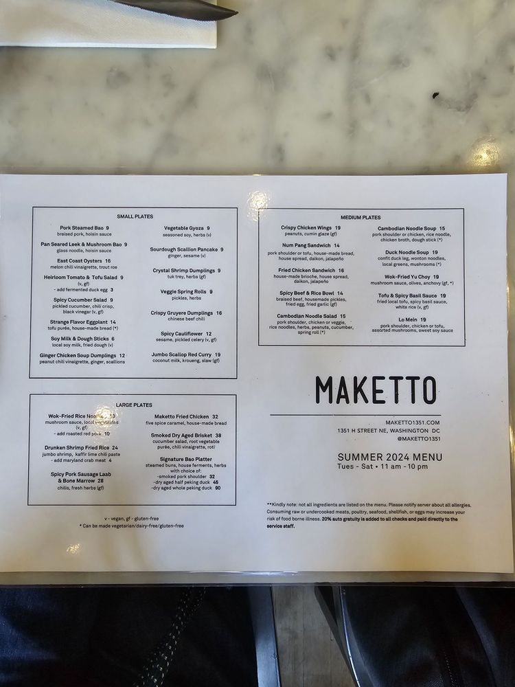 Introducing the menu at Maketto, a Cambodian-Taiwanese cafe in Washington, DC. Maketto offers a variety of fusion dishes influenced by the chef's Taiwanese and Cambodian background. Customers rave about the flavorful and exciting dishes, such as the Bao buns and Lo Mein. The restaurant provides vegan and vegetarian options, making it a great spot for those with dietary restrictions. While some found the dishes leaning more towards Taiwanese flavors, others enjoyed the unique twists in the menu. The fried chicken dish seems to be a crowd favorite, with moist and flavorful chicken. Overall, Maketto boasts a hip and casual ambiance, perfect for a brunch, lunch, or dinner outing with friends or a casual date. Experience the modern fusion food at Maketto and explore their extensive menu offerings.